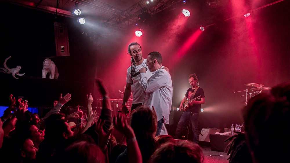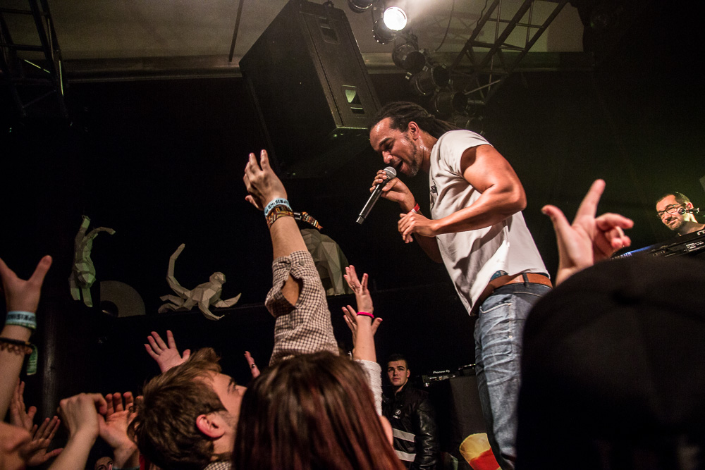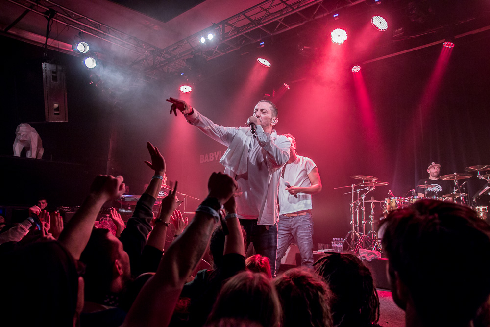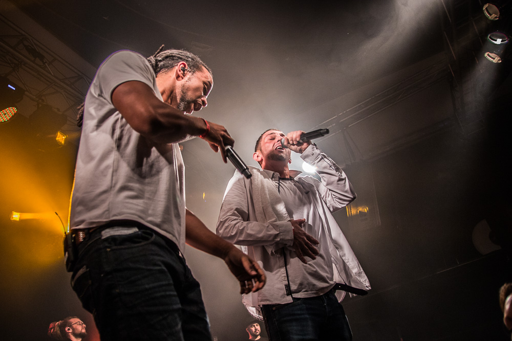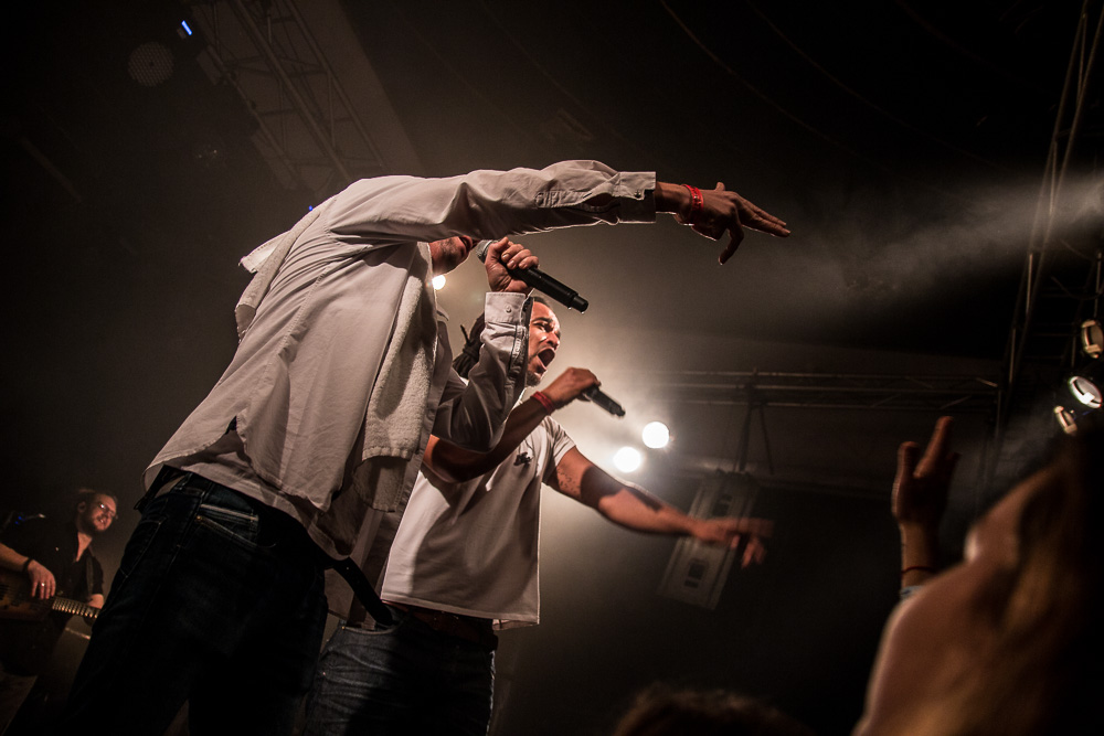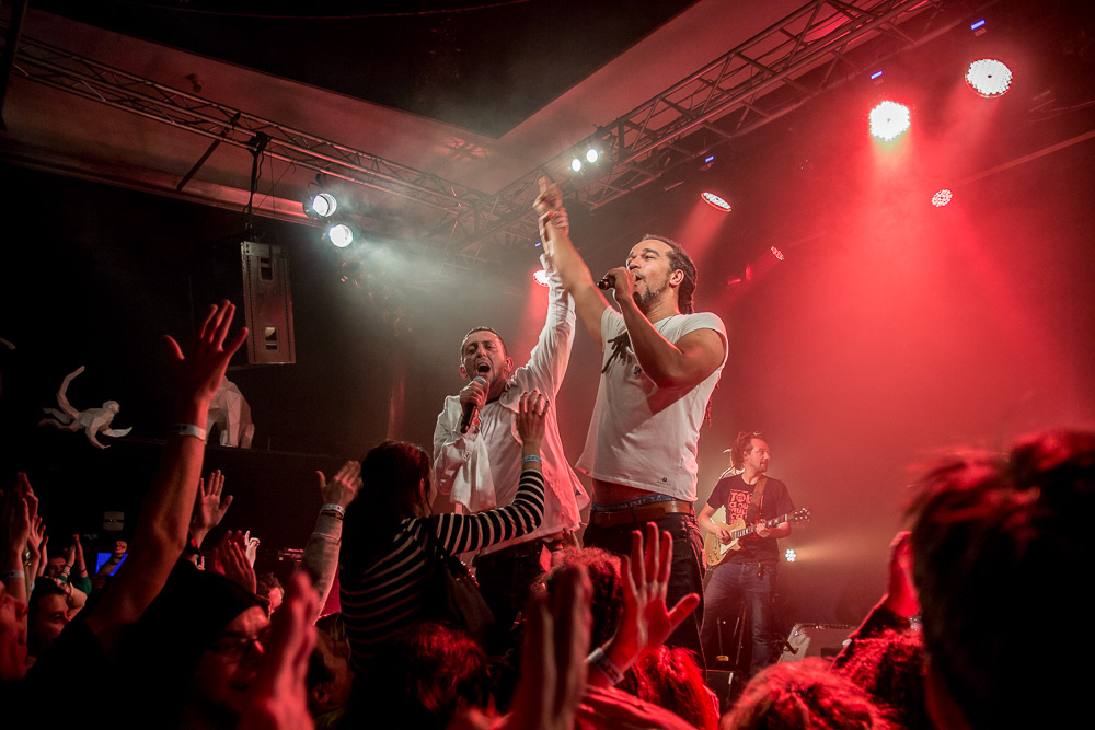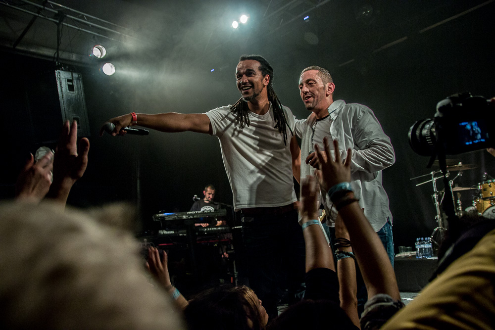 Sála sa plní beznádejne do posledného miestečka a očakáva obľúbených Francúzov. Na scénu vyjdú hudobníci z Dub Inc., ale spevákov nevidieť. Hakim a Komlan začali prvú pesničku spievať ešte zo zákulisia. Keď sa objavia, prekvapuje nás výrazne štíhlejší Hakim. Chlapci vpredu majú oblečené biele tričká, hudobníci sú v čiernom. Nechýba tričko s nápisom „Rude Boy Connection“ alebo „Tout ce qu’ils veulent ç’est une France qui ferme sa gueule“ (Všetko, čo chcem, je Francúzsko, ktoré zavrie papuľu.) Klub mi umožňuje všimnúť si zblízka Komlanovu kerku zvnútra ľavej paže – je v Braillovom písme. Jeho neskutočný hlas sa mi nikdy nezunuje a dávam za pravdu aj kočkám v predných radoch, ktoré z Auréliena „odpadávajú“. Od začiatku chalani hovoria po slovensky „Ďakujem“ a „Slovensko“. Diváci búrlivo reagujú, skáču, spievajú texty… Prierez albumami obsahuje 17 songov plus intro. Ťažisko tvoria piesne z aktuálneho albumu So What, vrátane titulnej piesne, ktorá bojuje proti fašizmu. Niekoľkokrát znie téma utečencov. Nie je sa čo diviť, sami speváci majú pôvod v Alžírsku a Benine. Sú Francúzi, ale nezabúdajú na korene. Pesničky Better Run a Exil venovali bratom z Afriky a Blízkeho východu, pri druhej im celá sála zapaľuje svetielka a zapaľovače. V skladbe Foudagh spieva Hakim nielen „arabským“ štýlom, ale aj v berberskom jazyku kabyle. Komlan sedí a hrá na darbuke. Rude Boy spievali všetci až do stop-timu, kedy Hakim roztlieskal publikum a pokračoval reggae časťou (Babylone système met en marge…). V poslednej pesničke pred prídavkom Fils de predstavovali jednotlivých členov kapely, ale dopriali big up aj nám, divákom. Nezabudli ani na osvedčený spúšťač obrovskej energie – posadiť publikum a nechať ho na povel vyskočiť. Prídavok obsahoval tri songy a pri poslednom Sounds Good vzdali hold všetkým vystupujúcim na tomto pódium a Komlan s Hakimom si zahrali hru, koho strana publika hlasnejšie zaspieva text. Aby hrali fair play, dohodli sa na výsledku 1:1. 🙂 Auréliena neskôr stretnem v dave fotiť sa s fanúšikmi. Neustále je usmiaty.