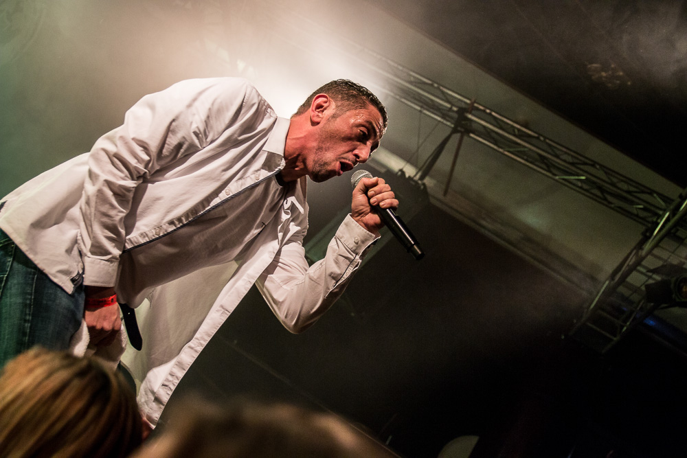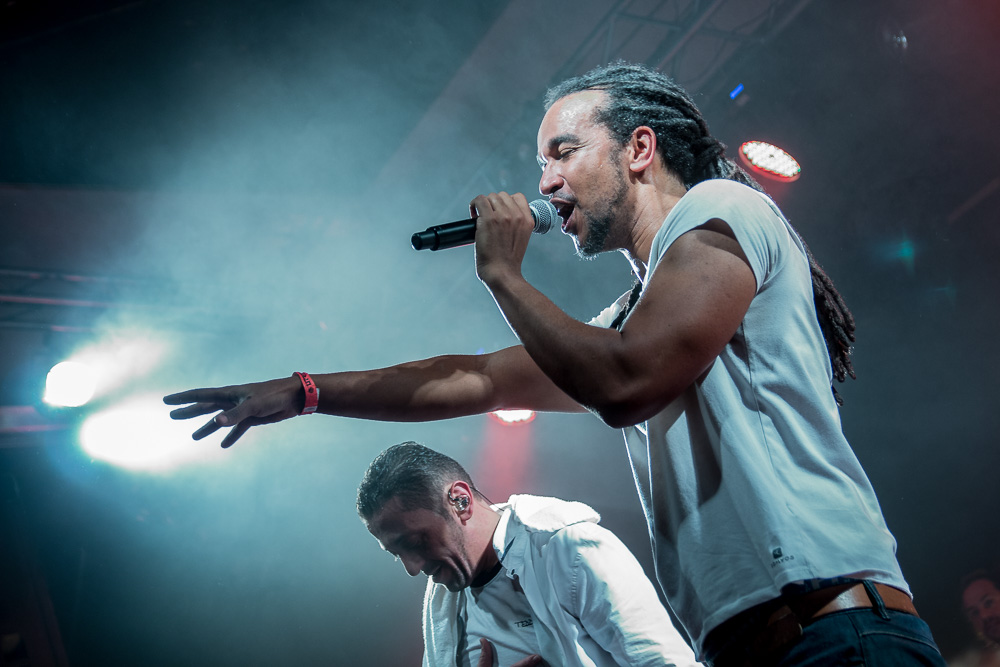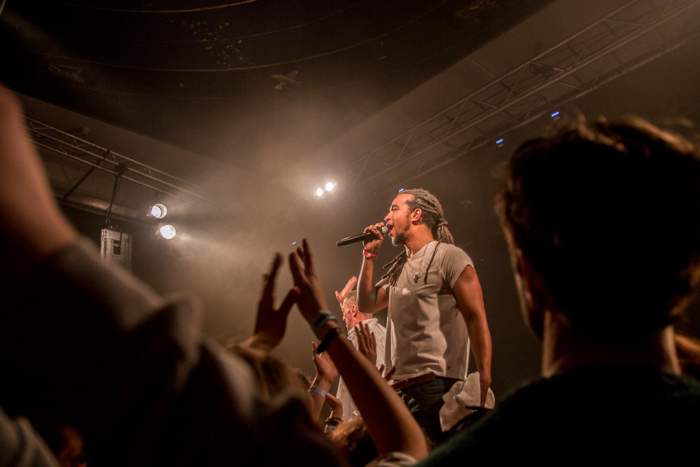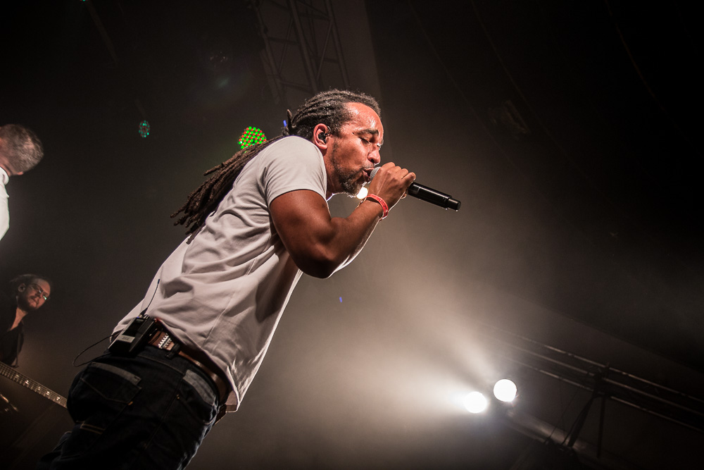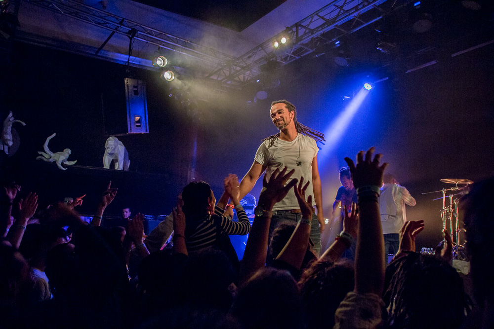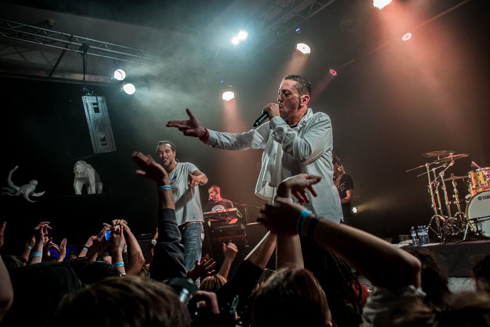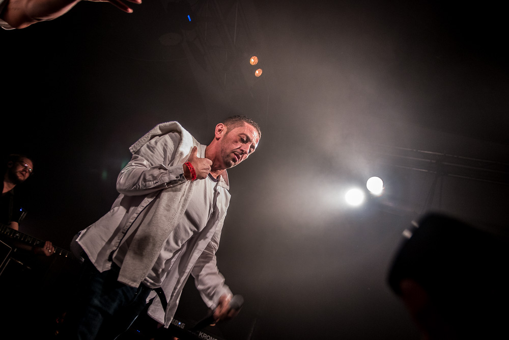 Sála sa plní beznádejne do posledného miestečka a očakáva obľúbených Francúzov. Na scénu vyjdú hudobníci z Dub Inc., ale spevákov nevidieť. Hakim a Komlan začali prvú pesničku spievať ešte zo zákulisia. Keď sa objavia, prekvapuje nás výrazne štíhlejší Hakim. Chlapci vpredu majú oblečené biele tričká, hudobníci sú v čiernom. Nechýba tričko s nápisom „Rude Boy Connection“ alebo „Tout ce qu’ils veulent ç’est une France qui ferme sa gueule“ (Všetko, čo chcem, je Francúzsko, ktoré zavrie papuľu.) Klub mi umožňuje všimnúť si zblízka Komlanovu kerku zvnútra ľavej paže – je v Braillovom písme. Jeho neskutočný hlas sa mi nikdy nezunuje a dávam za pravdu aj kočkám v predných radoch, ktoré z Auréliena „odpadávajú“. Od začiatku chalani hovoria po slovensky „Ďakujem“ a „Slovensko“. Diváci búrlivo reagujú, skáču, spievajú texty… Prierez albumami obsahuje 17 songov plus intro. Ťažisko tvoria piesne z aktuálneho albumu So What, vrátane titulnej piesne, ktorá bojuje proti fašizmu. Niekoľkokrát znie téma utečencov. Nie je sa čo diviť, sami speváci majú pôvod v Alžírsku a Benine. Sú Francúzi, ale nezabúdajú na korene. Pesničky Better Run a Exil venovali bratom z Afriky a Blízkeho východu, pri druhej im celá sála zapaľuje svetielka a zapaľovače. V skladbe Foudagh spieva Hakim nielen „arabským“ štýlom, ale aj v berberskom jazyku kabyle. Komlan sedí a hrá na darbuke. Rude Boy spievali všetci až do stop-timu, kedy Hakim roztlieskal publikum a pokračoval reggae časťou (Babylone système met en marge…). V poslednej pesničke pred prídavkom Fils de predstavovali jednotlivých členov kapely, ale dopriali big up aj nám, divákom. Nezabudli ani na osvedčený spúšťač obrovskej energie – posadiť publikum a nechať ho na povel vyskočiť. Prídavok obsahoval tri songy a pri poslednom Sounds Good vzdali hold všetkým vystupujúcim na tomto pódium a Komlan s Hakimom si zahrali hru, koho strana publika hlasnejšie zaspieva text. Aby hrali fair play, dohodli sa na výsledku 1:1. 🙂 Auréliena neskôr stretnem v dave fotiť sa s fanúšikmi. Neustále je usmiaty.