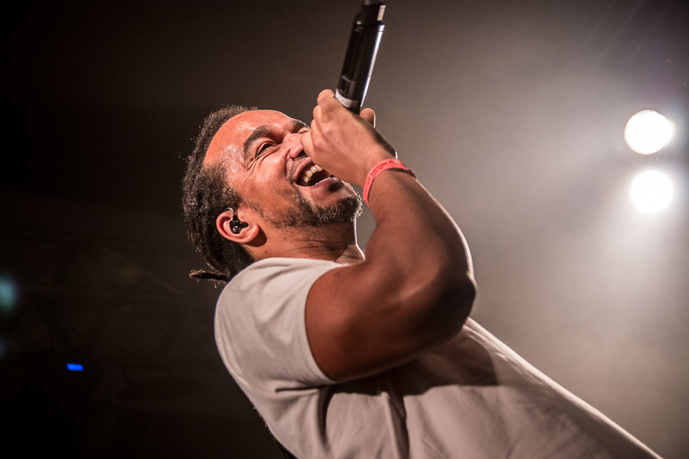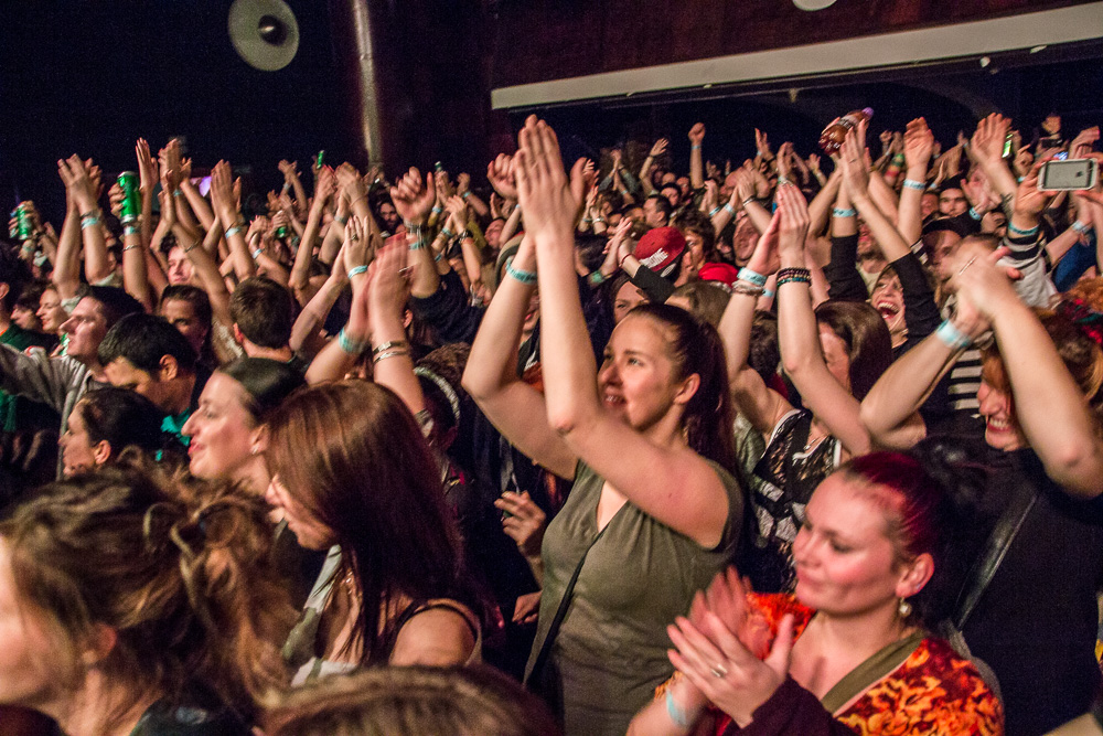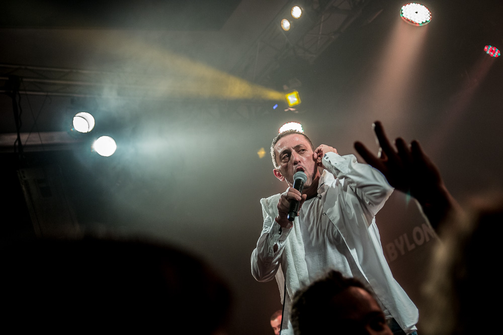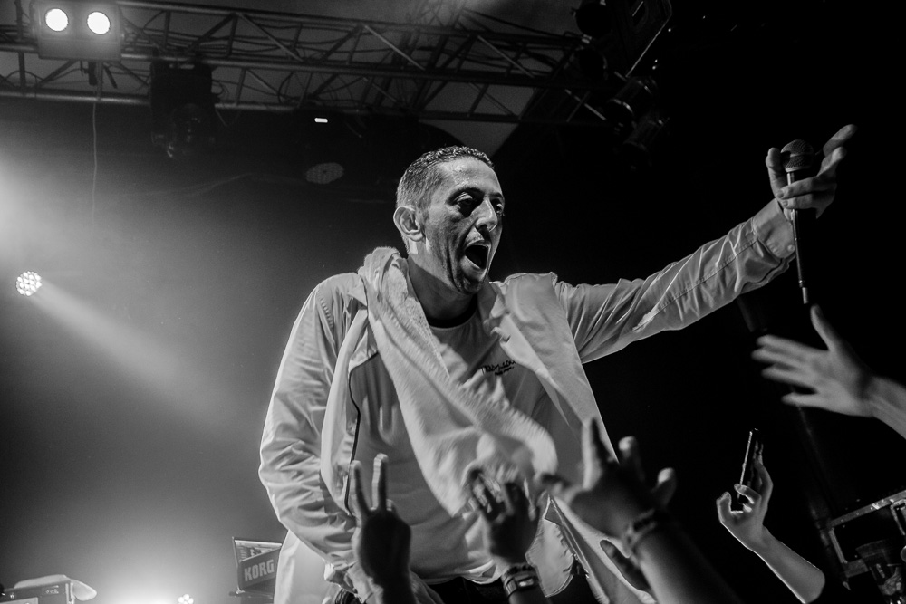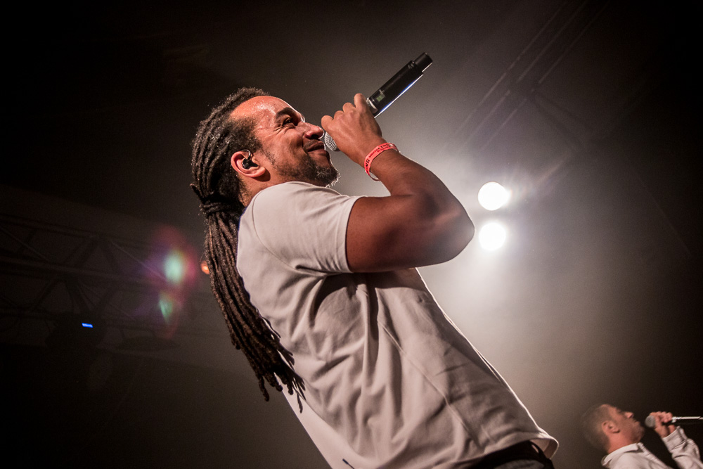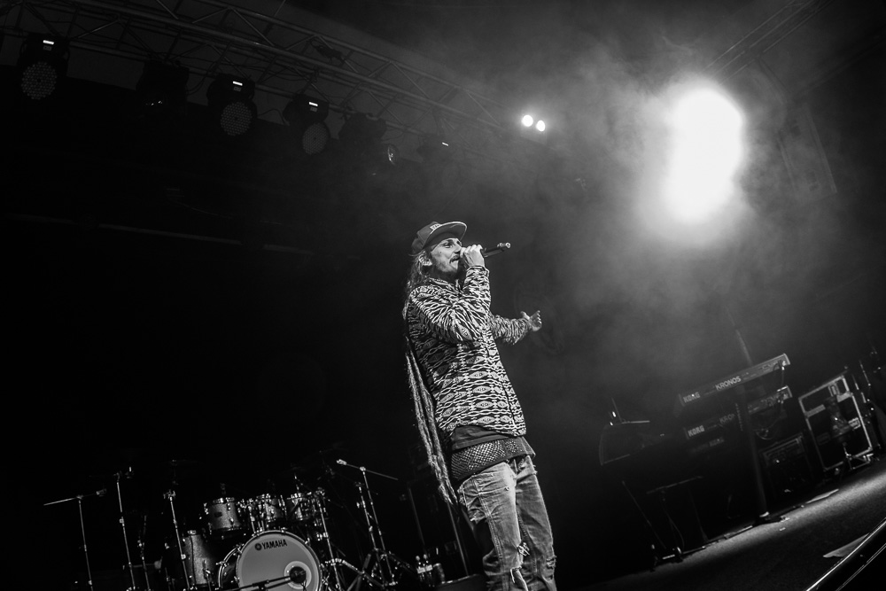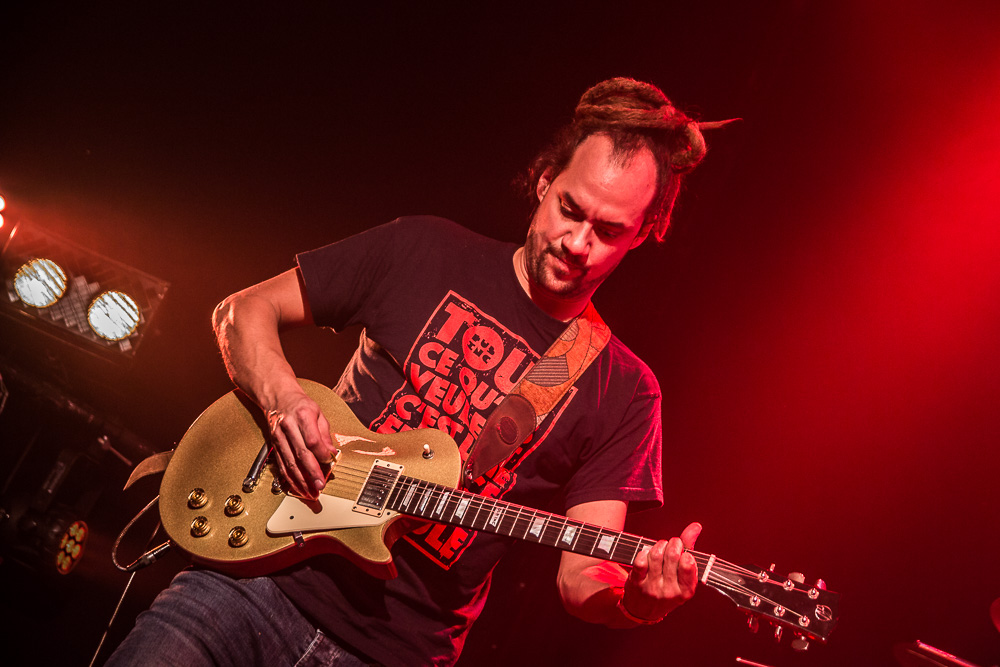 Sála sa plní beznádejne do posledného miestečka a očakáva obľúbených Francúzov. Na scénu vyjdú hudobníci z Dub Inc., ale spevákov nevidieť. Hakim a Komlan začali prvú pesničku spievať ešte zo zákulisia. Keď sa objavia, prekvapuje nás výrazne štíhlejší Hakim. Chlapci vpredu majú oblečené biele tričká, hudobníci sú v čiernom. Nechýba tričko s nápisom „Rude Boy Connection“ alebo „Tout ce qu’ils veulent ç’est une France qui ferme sa gueule“ (Všetko, čo chcem, je Francúzsko, ktoré zavrie papuľu.) Klub mi umožňuje všimnúť si zblízka Komlanovu kerku zvnútra ľavej paže – je v Braillovom písme. Jeho neskutočný hlas sa mi nikdy nezunuje a dávam za pravdu aj kočkám v predných radoch, ktoré z Auréliena „odpadávajú“. Od začiatku chalani hovoria po slovensky „Ďakujem“ a „Slovensko“. Diváci búrlivo reagujú, skáču, spievajú texty… Prierez albumami obsahuje 17 songov plus intro. Ťažisko tvoria piesne z aktuálneho albumu So What, vrátane titulnej piesne, ktorá bojuje proti fašizmu. Niekoľkokrát znie téma utečencov. Nie je sa čo diviť, sami speváci majú pôvod v Alžírsku a Benine. Sú Francúzi, ale nezabúdajú na korene. Pesničky Better Run a Exil venovali bratom z Afriky a Blízkeho východu, pri druhej im celá sála zapaľuje svetielka a zapaľovače. V skladbe Foudagh spieva Hakim nielen „arabským“ štýlom, ale aj v berberskom jazyku kabyle. Komlan sedí a hrá na darbuke. Rude Boy spievali všetci až do stop-timu, kedy Hakim roztlieskal publikum a pokračoval reggae časťou (Babylone système met en marge…). V poslednej pesničke pred prídavkom Fils de predstavovali jednotlivých členov kapely, ale dopriali big up aj nám, divákom. Nezabudli ani na osvedčený spúšťač obrovskej energie – posadiť publikum a nechať ho na povel vyskočiť. Prídavok obsahoval tri songy a pri poslednom Sounds Good vzdali hold všetkým vystupujúcim na tomto pódium a Komlan s Hakimom si zahrali hru, koho strana publika hlasnejšie zaspieva text. Aby hrali fair play, dohodli sa na výsledku 1:1. 🙂 Auréliena neskôr stretnem v dave fotiť sa s fanúšikmi. Neustále je usmiaty.
